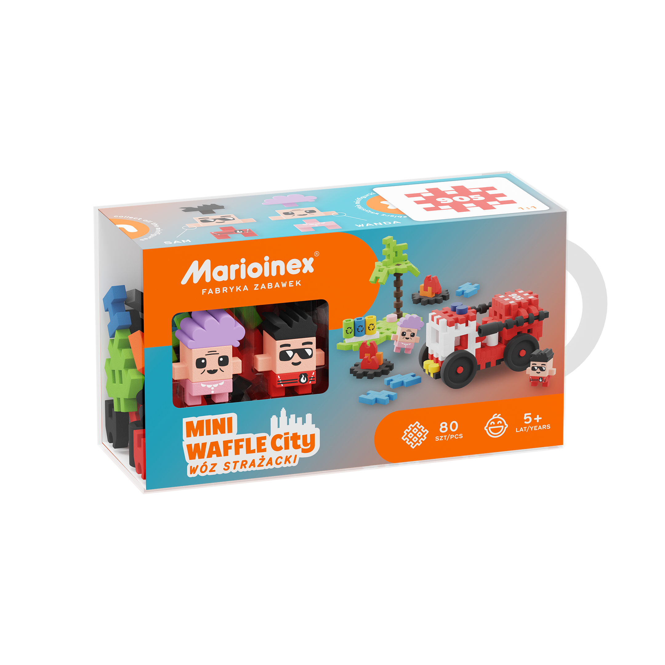 Het was weer een fijne dag in Waffle City. Miss Wanda was op weg terug van een wandeling en liep richting het kleine park dat naar haar appartement leidt. Plotseling rook ze een sterke brandlucht. Geschrokken zag ze dat er brand was uitgebroken bij de vuilcontainer. Zonder aarzelen greep ze haar telefoon en belde de brandweer! De brandweerwagen, uitgerust met een waterkanon en bestuurd door brandweerman Sam, had het vuur binnen enkele ogenblikken onder controle! Daarom heeft elke stad een heldhaftige brandweerman nodig. Bouw je eigen brandweerwagen waarmee je elke brand kunt blussen. De bijgeleverde handleiding inspireert je kindje tot het bouwen van leuke creaties! In totaal bevat deze set 80 onderdelen en 2 figuren: Miss Wanda en brandweerman Sam.