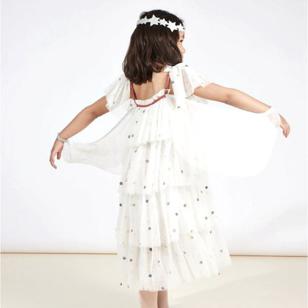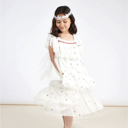 Tulle verkleedjurk met glitter Angel van MERI MERI is perfect voor toneelstukken, feestjes en verkleedpartijen, voor uren fantasierijk plezier. Het kostuum heeft een prachtige tule jurk met roze, gouden en zilveren lovertjes als delicaat detail, met verwijderbare vleugels, en een zilveren glitter ster hoofdband.