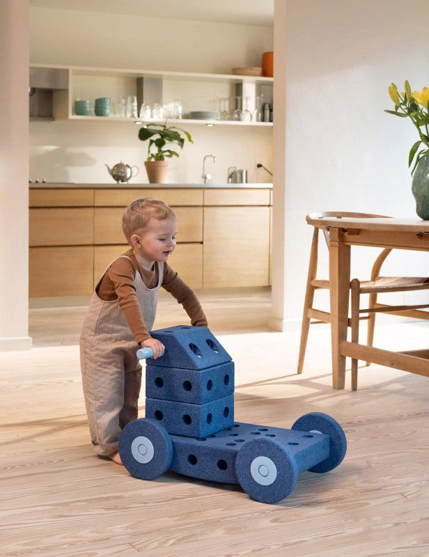 Wat maakt MODU nu precies zo goed voor de ontwikkeling? Wel, active play is het antwoord! De blokken vormen een uitdaging op creatief én motorisch vlak, want ze kunnen opgebouwd worden dankzij bijgeleverde instructies, maar kinderen kunnen uiteraard ook fantasie-creaties maken. Karretjes met wielen, een raket om af te vuren, een wiebelbrug oversteken, met mama een toren bouwen, of samen met papa een giraf met een heeeele lange nek maken…
