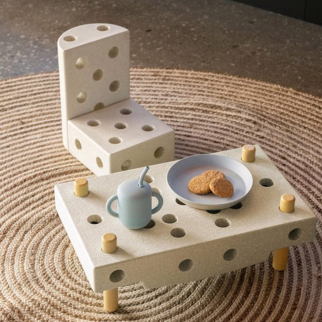 Bovendien kan spelen, bouwen, bedenken en creëren met MODU op een verantwoorde manier, want MODU is gemaakt uit ecologisch materiaal. Lees er in onze specificaties meer over. De bewuste keuze van MODU voor duurzame materialen komt zowel tot uiting in het speelgoed als de spelvorm van MODU die beide duurzaam zijn. Heel vaak groeien kinderen helaas erg snel uit speelgoed uit -zeker op jonge leeftijd-, en precies dàt is heel anders bij het multifunctionele MODU. Want als je kindje een fase en een bepaalde creatie ontgroeid is, dan bouw je gewoon een andere. En zo doet MODU je kindje groeien, maar groeit MODU ook met je kleine bouwer mee!