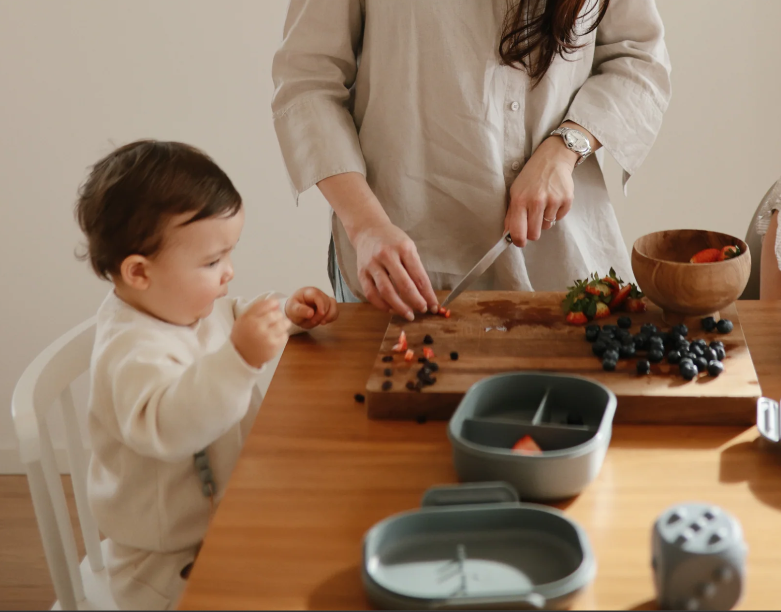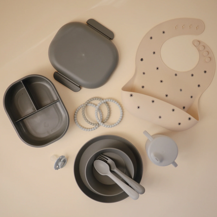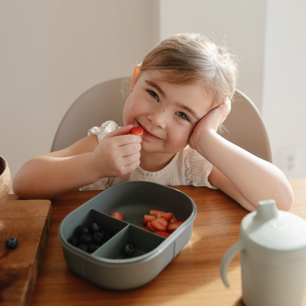 Supertoffe lunchbox van Mushie. De brooddoos heeft ingebouwde compartimenten die je voedsel gescheiden houdt. Ook zit er bestek en een handig verdeelcompartiment bij.