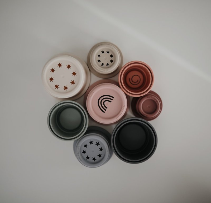 Superleuke stapeltoren van het merk MUSHIE. Zachte pastelkleurtjes die mooi in uw interieur passen. Elk potje heeft ook leuke vormpjes bovenaan.