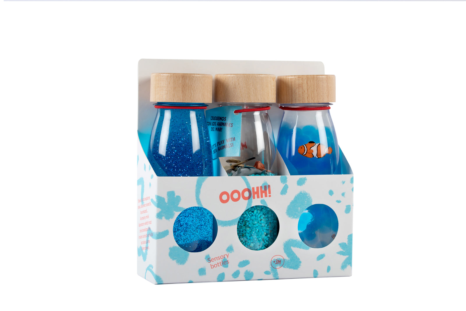 Verpakking met 3 sensorische flessen: Float Blue, Spy Sea en Sound Fish
