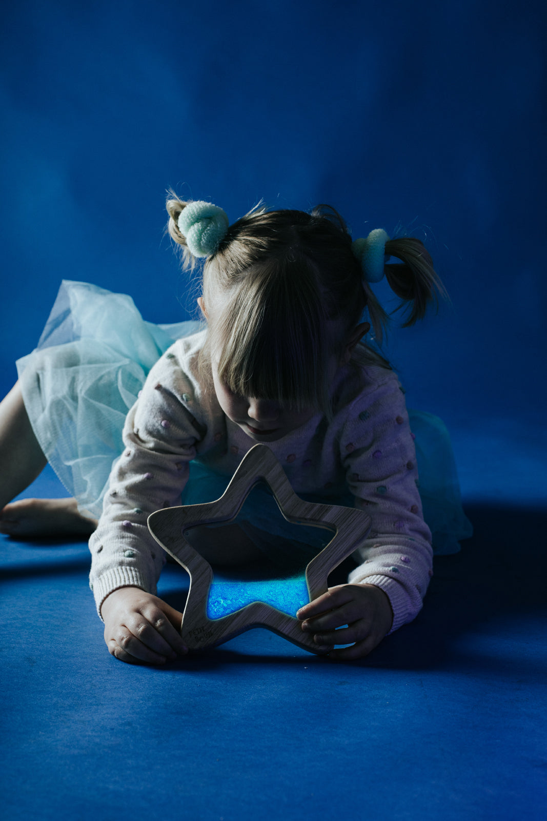 Deze sensorische ster van Petit Boum is fascinerend voor je kindje vanaf 6 maanden. Deze ster is gevuld met kleurrijke vloeistoffen, glitter en fluorescerende vloeistoffen die oplichten in het donker.