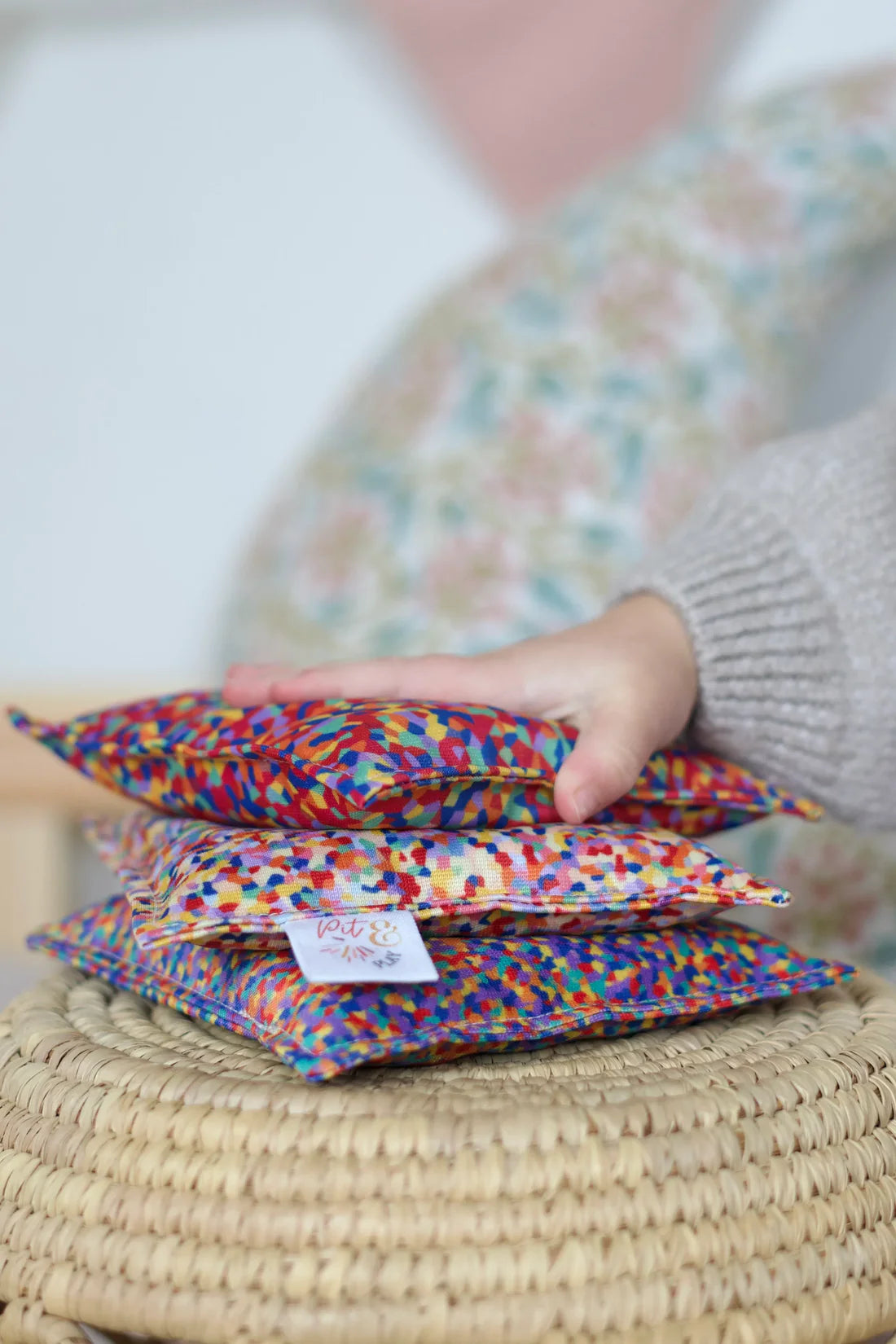 De zakjes groeien mee met de speelbeleving en fantasie van je kind. Geschikt voor kinderen van 0 tot 8 jaar oud. Dit speelgoed prikkelt de zintuigen van je kindje en is goed voor de motorische- en sociale ontwikkeling. Gooien, voelen, balanceren, over heen lopen, poppenbedjes maken, kleur herkenning. Heel veelzijdig speelgoed.