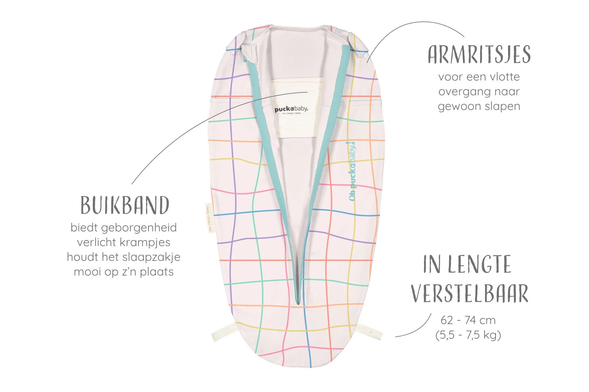Puckababy inbakerslaapzak om je baby veilig in te bakeren. Slaapoplossing voor baby's die vaak huilen. Bevordert een gezond slaapritme. Deze gepatenteerde en bekroonde inbakerslaapzak past perfect: niet te strak, niet te warm, eenvoudig te gebruiken en stijlvol. Gemaakt van 100% katoen. 0.5 TOG. Een leuk coconnetje met prachtige details. Voor ouders die enkel het beste voor hun kleintje willen. Nederlands design, gemaakt in Europa.