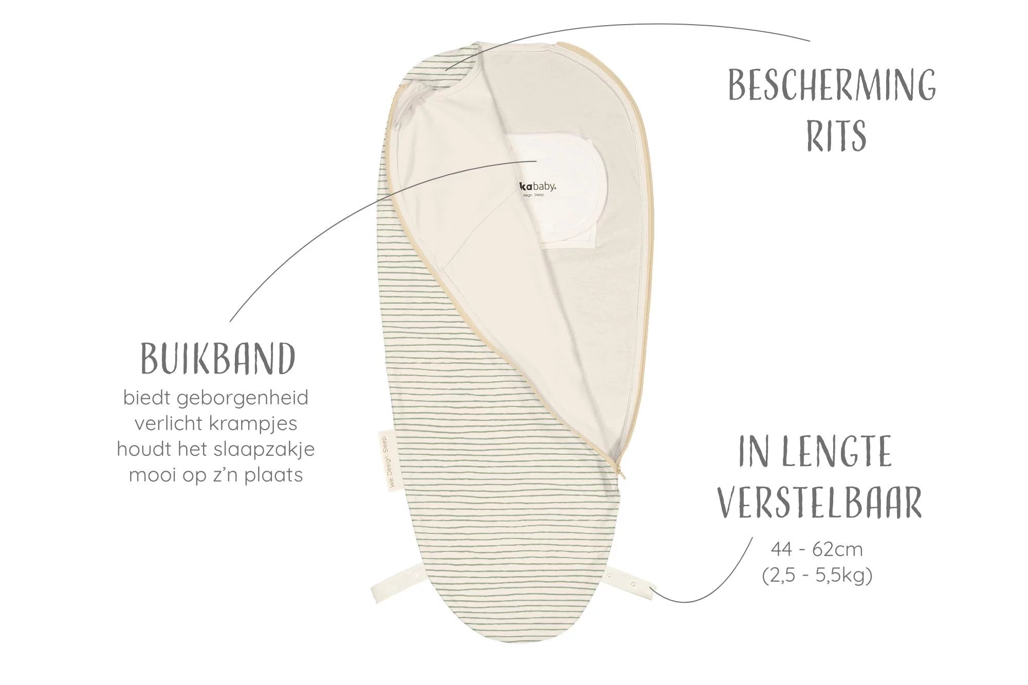 | Maat slaapzak | 60 cm en Inbakeren |