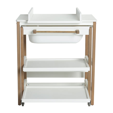 Dit prachtige badmeubel in de kleur white en natural is perfect om je kindje een fris badje in te geven. Onder dit badje zijn er twee uitschuifbare volle leggers beschikbaar. Deze ruimte kan je gebruiken om een toilettasje te plaatsen met verzorgingsproducten tijdens het wassen, een handdoek, propere kleertjes voor als je baby gewassen is.