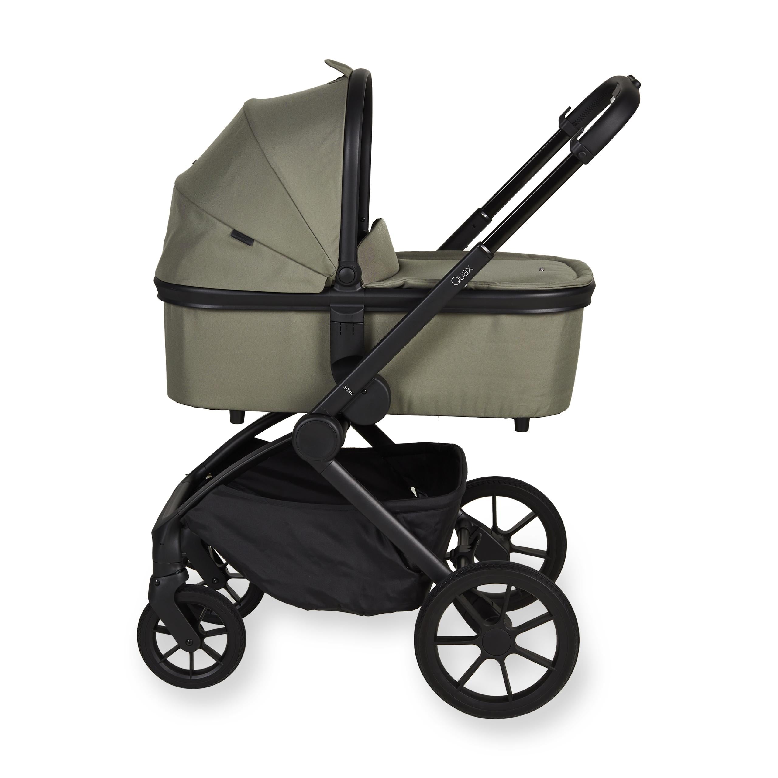 De draagmand uit de Echo collectie van Quax zet je moeiteloos op de Echo plooibuggy van Quax. Deze draagmand heeft een kap met ventilatieopeningen. Je kan de kap ook volledig platleggen.