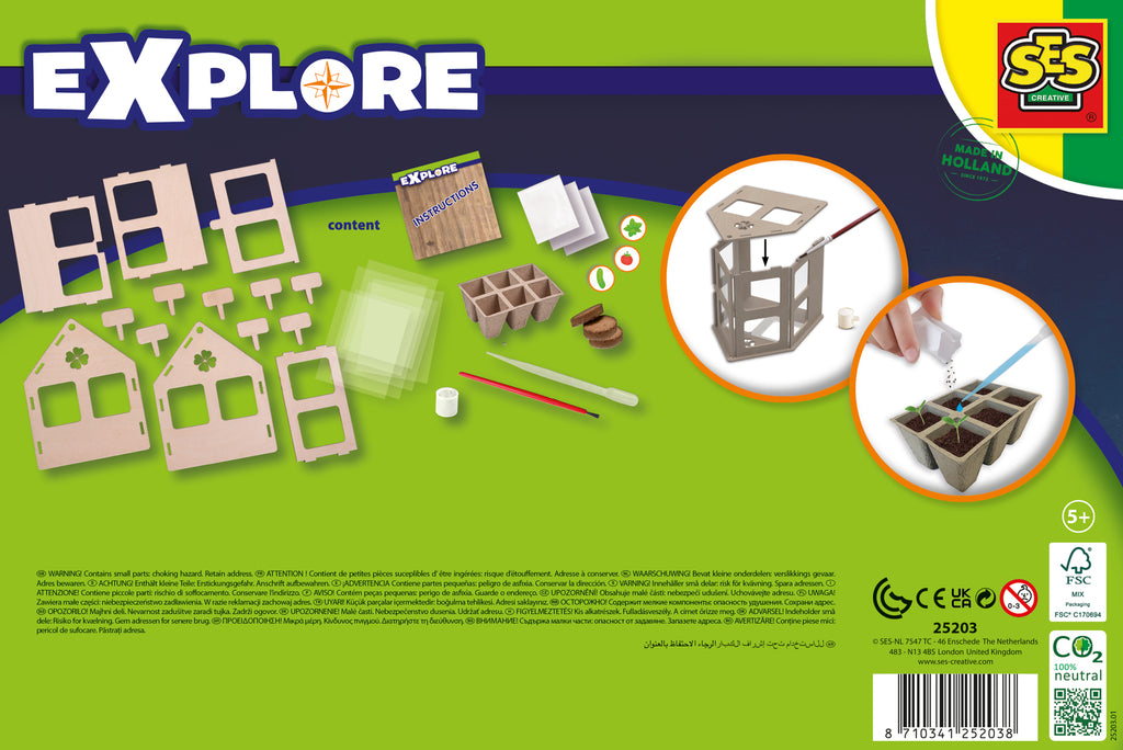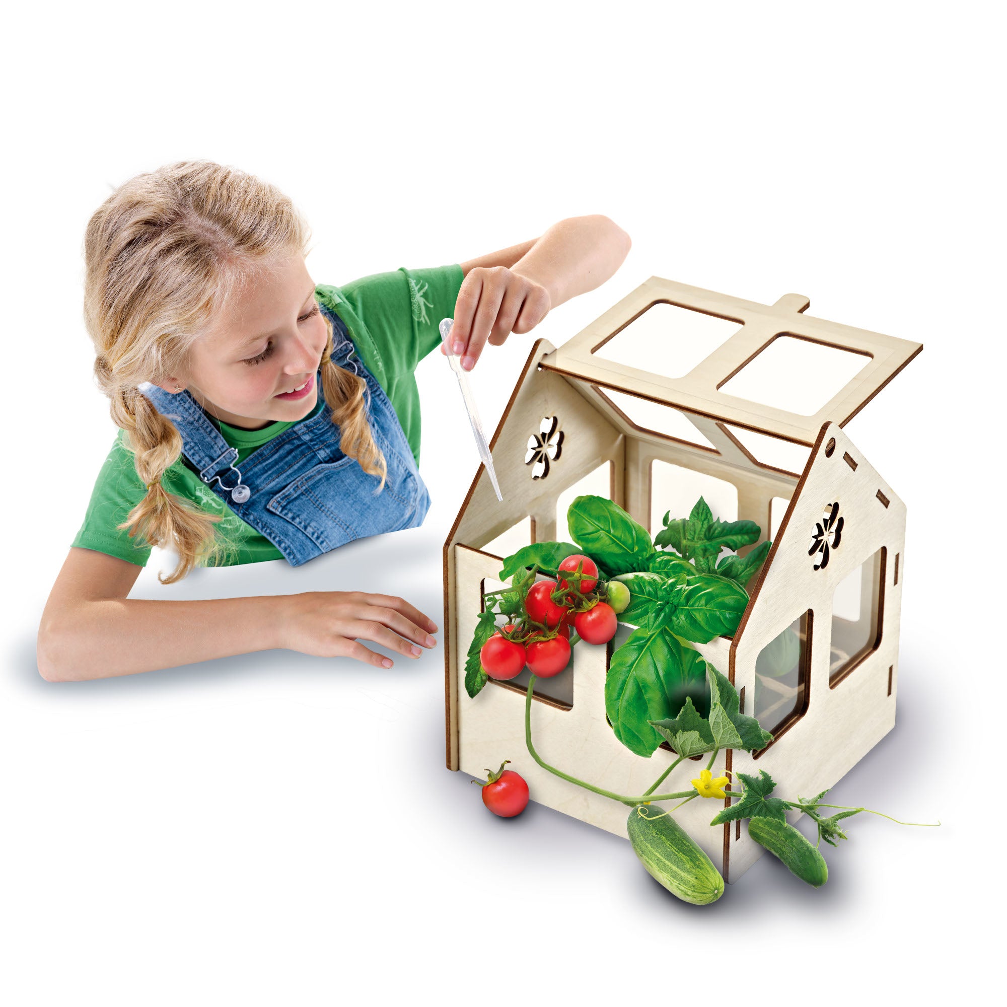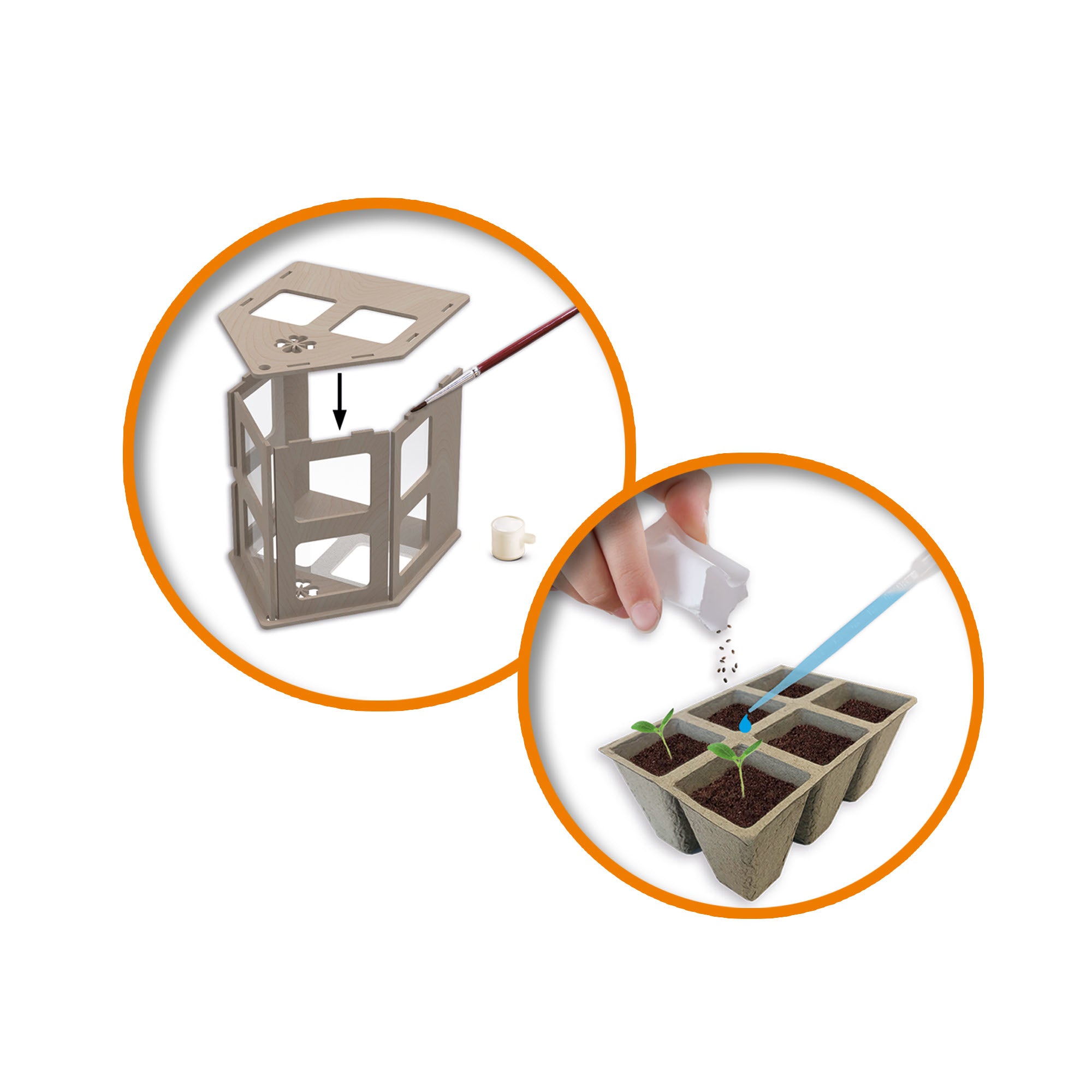 Inhoud: houten delen broeikas, transparante sheets voor ramen broeikas, lijm, penseel, plantenprikkers, kweektray, kokos potgrond tabletten, zaden tomaat, zaden basilicum, zaden komkommer, pipet, instructies