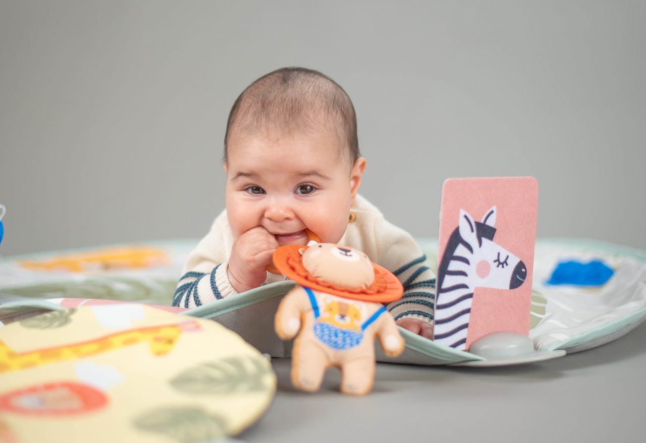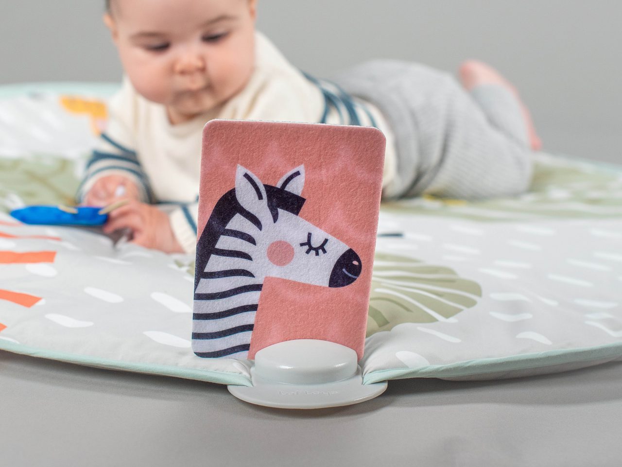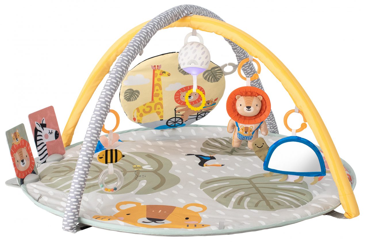 Superleuke dikke, gewatteerde speelmat van Taf Toys die gefocust is op het buikliggen. Aan de ene helft heeft deze babygym een unieke vloerboog waar je speeltjes kan plaatsen.