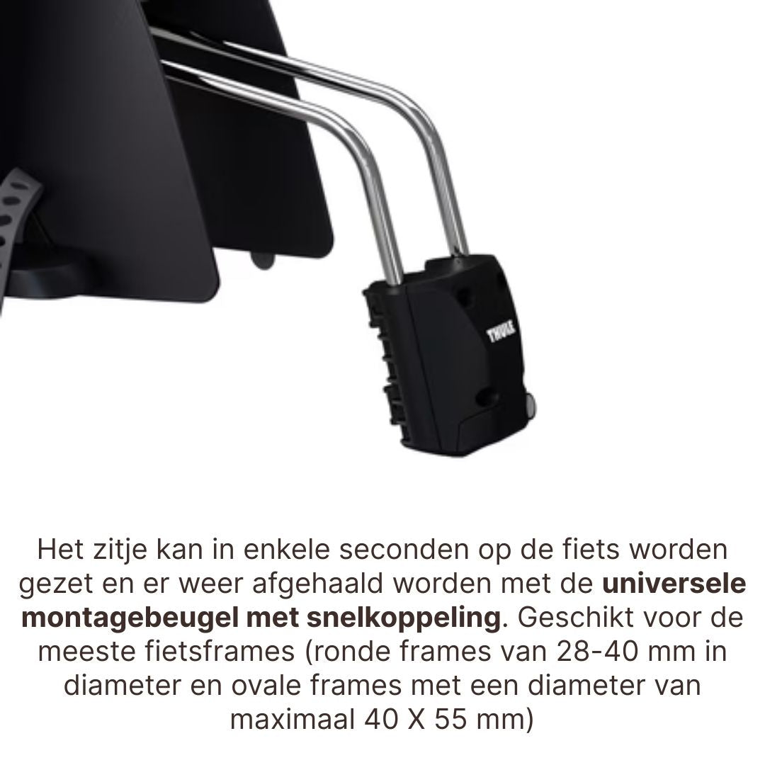 Met een Thule RideAlong fietszitje is het gemakkelijker dan ooit om de kinderen mee te nemen voor een ritje. Door de montagebeugel met snelkoppeling is het zitje supermakkelijk en snel te installeren. De montagebeugel wordt vanaf de voorkant met bouten vastgezet, waar er genoeg ruimte is om gereedschap te gebruiken. Als de montagebeugel eenmaal is vastgezet klikt het zitje in de juiste positie en is het in enkele seconden klaar voor gebruik. Het fietszitje kan ook achteroverhellen voor extra comfort en een lekker dutje onderweg.