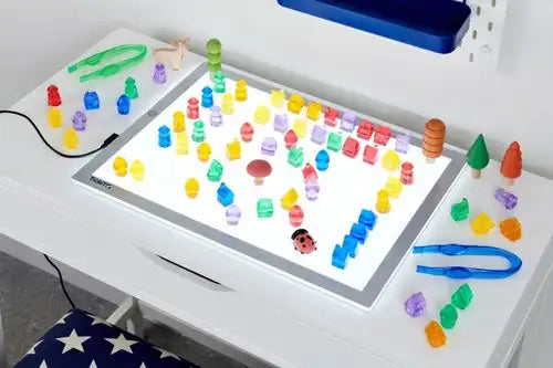 De doorschijnende eigenschappen maken ze ideaal voor gebruik met een lichtpaneel om de verbeelding van uw kind te prikkelen en kleuren en de voelbare markeringen op elke vorm te verkennen.