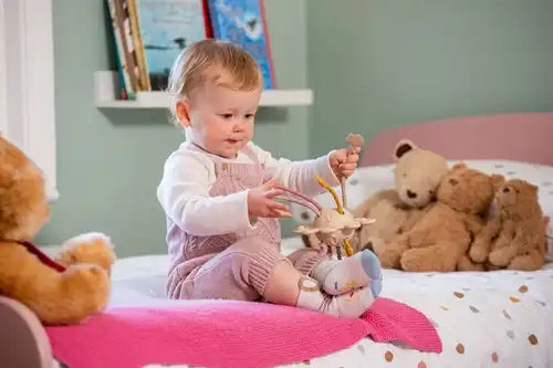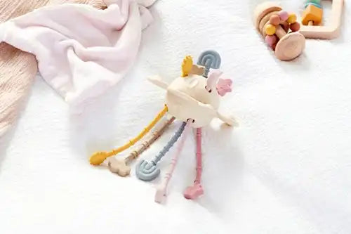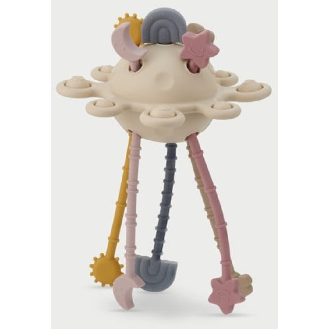 Sensorisch trekspeeltje. Een veelzijdig trek-speeltje van Tickit met een mix van tactiele, zintuiglijke en visuele elementen. De geribbelde tentakels maken ritsende geluiden terwijl ze door het speeltje worden getrokken, elk in een andere kleur en met verschillende vormen en patronen. Er zijn knopjes aan de buitenkant die een geluid maken wanneer ze worden ingedrukt, ideaal voor rustige activiteit.