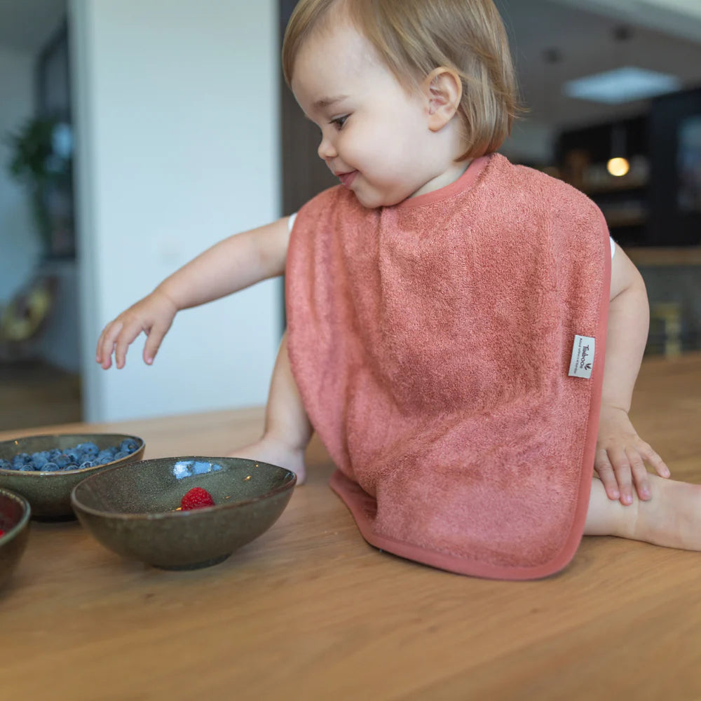 Praktische Timboo bamboeslab, geschikt om kleding te beschermen. Door de twee drukknopen kan de slab in twee verschillende standen dicht gemaakt worden, waardoor ze zowel voor baby's als peuters past. Deze slab is in verscheidene kleuren te verkrijgen.