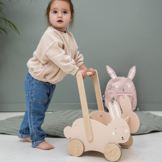 Leuke houten duwkar waar je kleintje al zijn of haar favoriete goodies in kan wegstoppen & vervoeren.