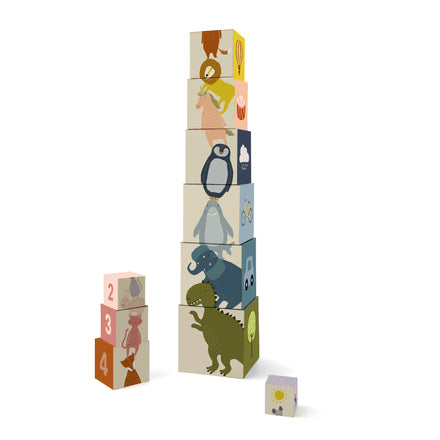 Pret gegarandeerd met deze stapelblokken van Trixie Baby! Aan elke kant van de blokken kan je een ander thema ontdekken, zodat kinderen op een speelse manier kunnen bijleren. De set bestaat uit 10 kleurrijke blokken. Kinderen kunnen de blokken stapelen, een leuke dierenpuzzel maken, de blokken op grootte sorteren, leren tellen of voorwerpen benoemen. Er zijn talloze manieren om met deze blokken te spelen. Een absolute must-have onder het kinderspeelgoed! De blokken zijn gemaakt van sterk FSC© karton en zijn bedrukt met soya inkt.