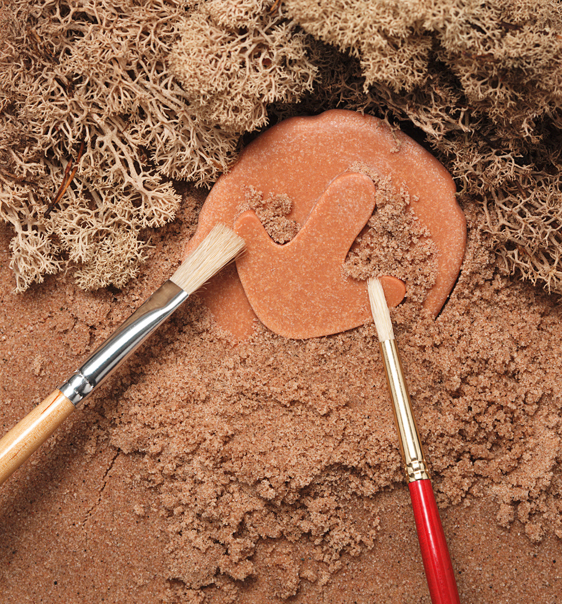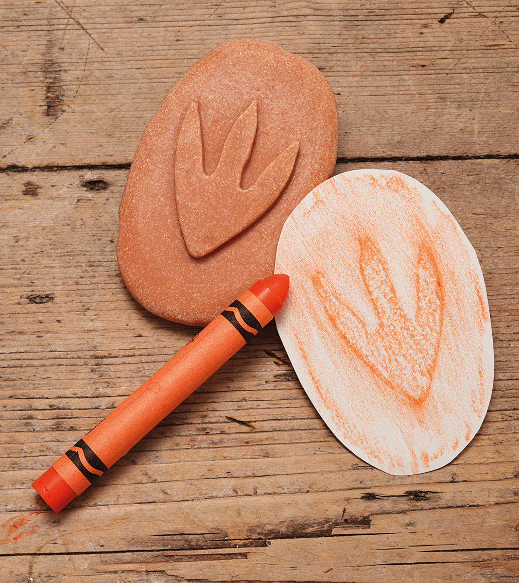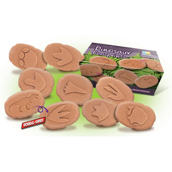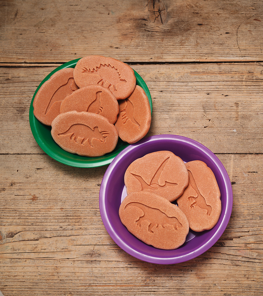 Volg de voetstappen van de dino's om ze te vinden. Elke dubbelzijdige steen heeft langs de ene kant de verhoogde voetafdruk van een dino en langs de andere kant een foto van deze dino. Druk de voetafdrukken in het zand en maak een pad dat je kindje kan volgen. Welke dino vinden ze aan het einde van het pad?