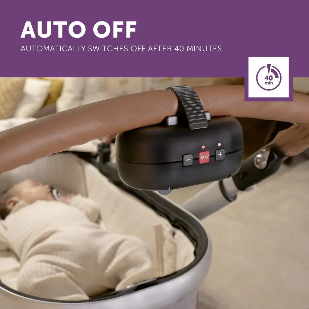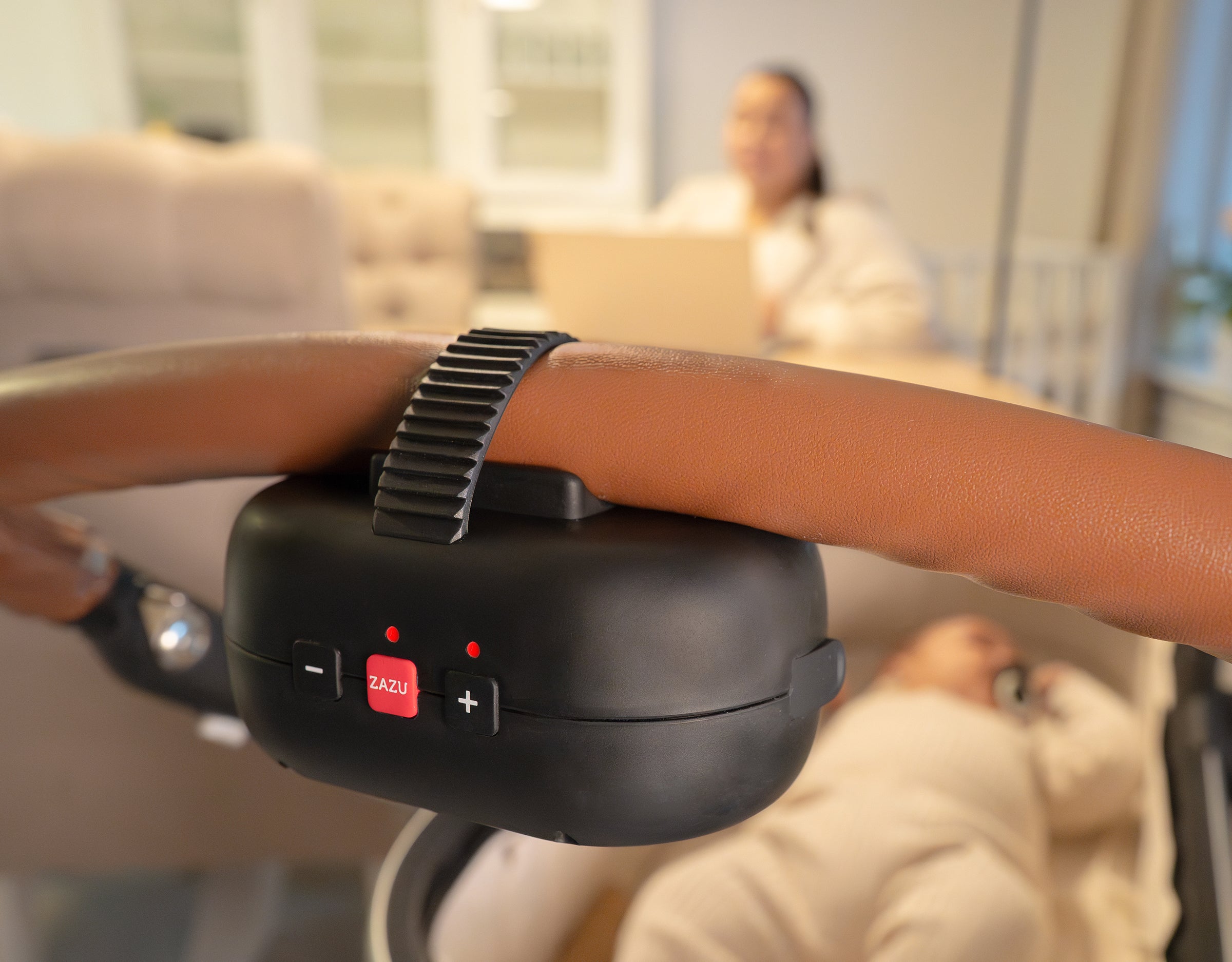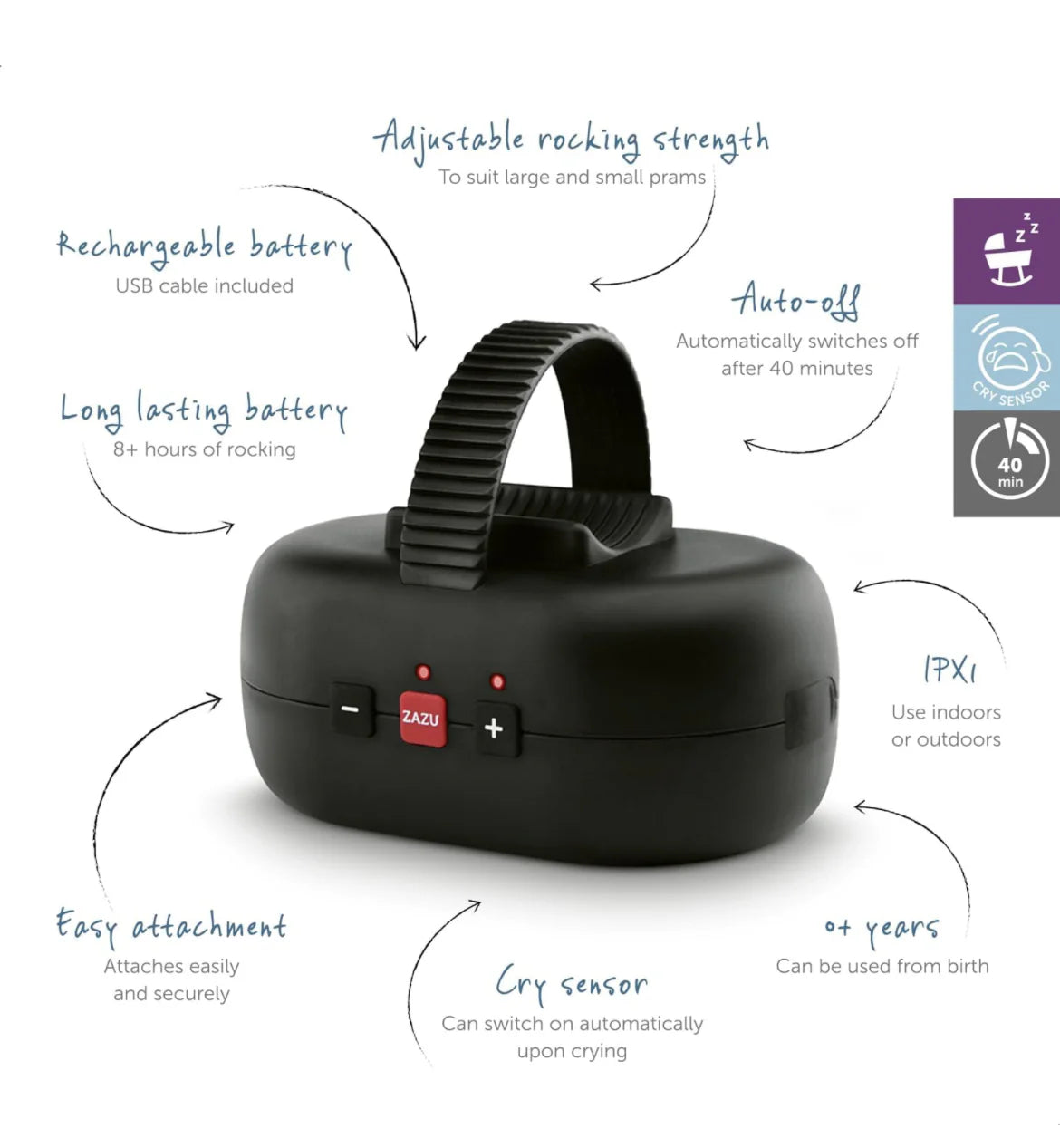 Robby de baby rocker van Zazu zorgt ervoor dat je kindje zorgeloos in slaap valt in de kinderwagen. Dit toestel met oplaadbare batterij en huilsensor neemt het zachte wiegen van de kinderwagen over, zodat je zelf je handen vrij hebt.