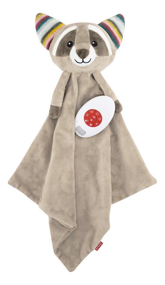 Becky, Felix of Robin zal jouw kindje om het even waar troosten. Dit knuffeldoekje is niet alleen zacht en houdt uw kleintje zijn fopspeen bij, dit muziekdoosje is eveneens voorzien van een module die verschillende geluiden afspeelt zodat uw kindje rustig wordt. Je kan kiezen uit hartslaggeluiden, witte ruis, natuurgeluiden of 3 rustgevende slaapliedjes. De timerfunctie zorgt ervoor dat deze automatisch uitschakelt na 10 min, terwijl de huilsensor ervoor zorgt dat het laatst afgespeelde geluid terug wordt ingeschakeld wanneer je baby huilt. Het volume kan aangepast worden. Met de velcro loop hang je dit knuffeldoekje vast aan de kinderwagen of autostoel.